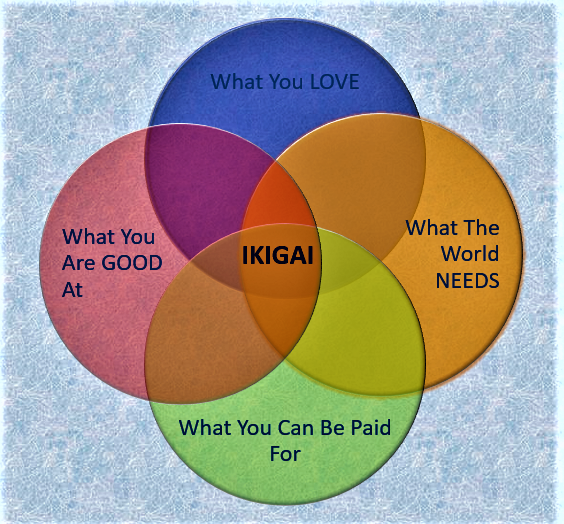 The concept of Ikigai originates from the Japanese words Iki (to live) and Gai (reason) and roughly translates to “reason for being”, thus finding meaning in life and doing something that makes life worth living.